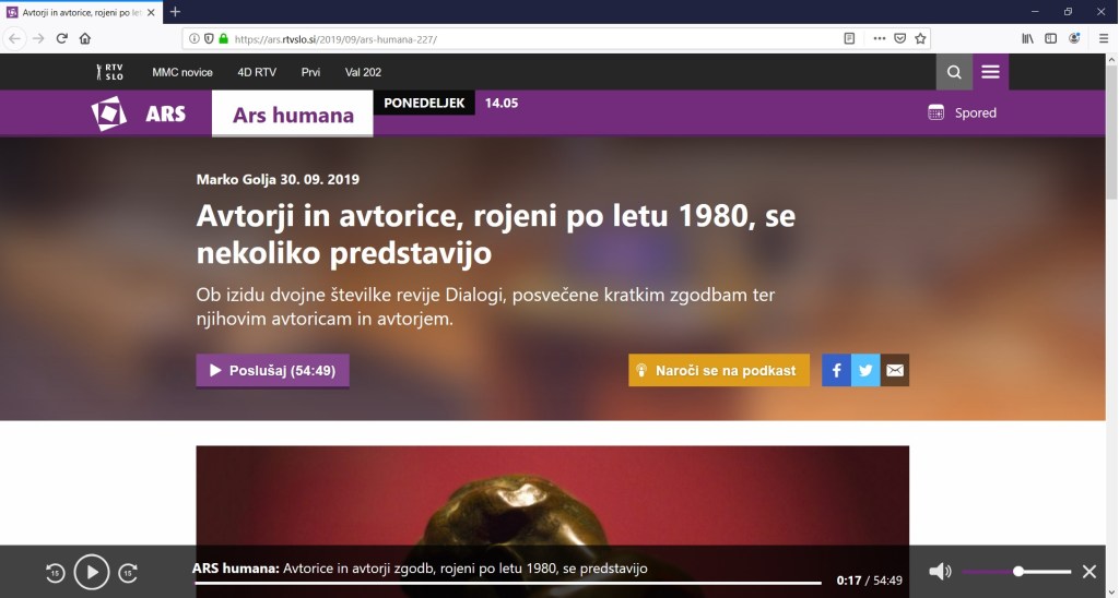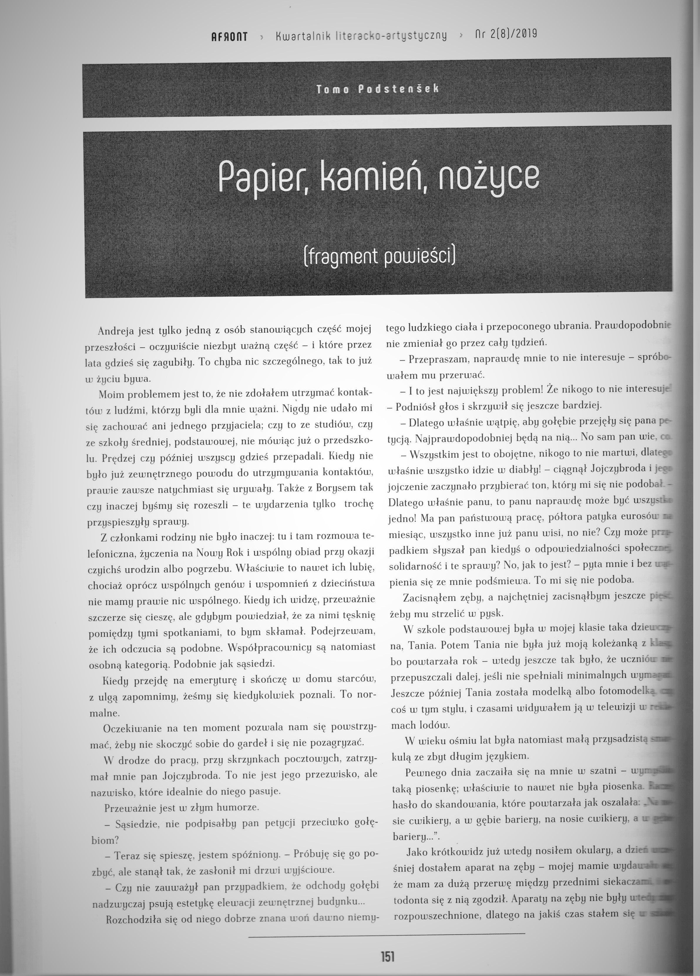 V poljski literarno-umetniški reviji AFRONT je bil objavljen prevod odlomka iz romana Papir, kamen, škarje (Litera, 2016).