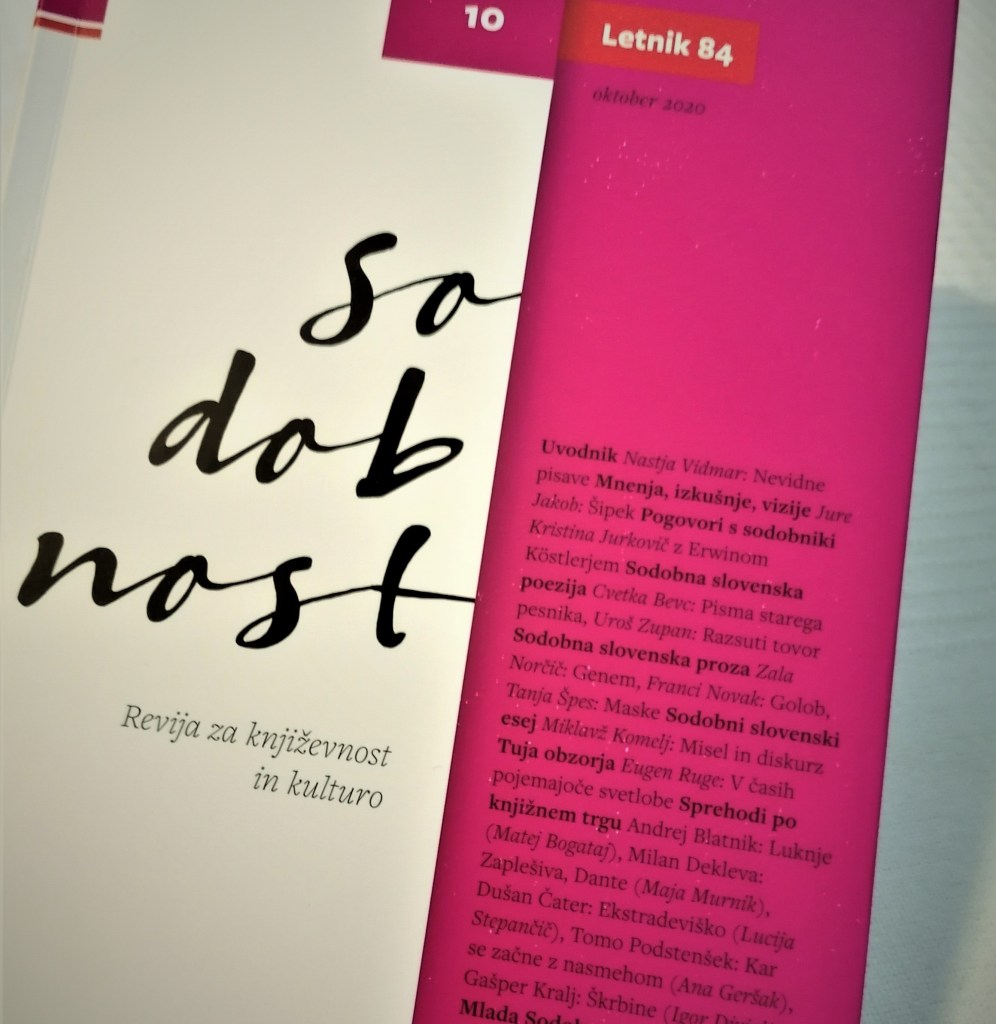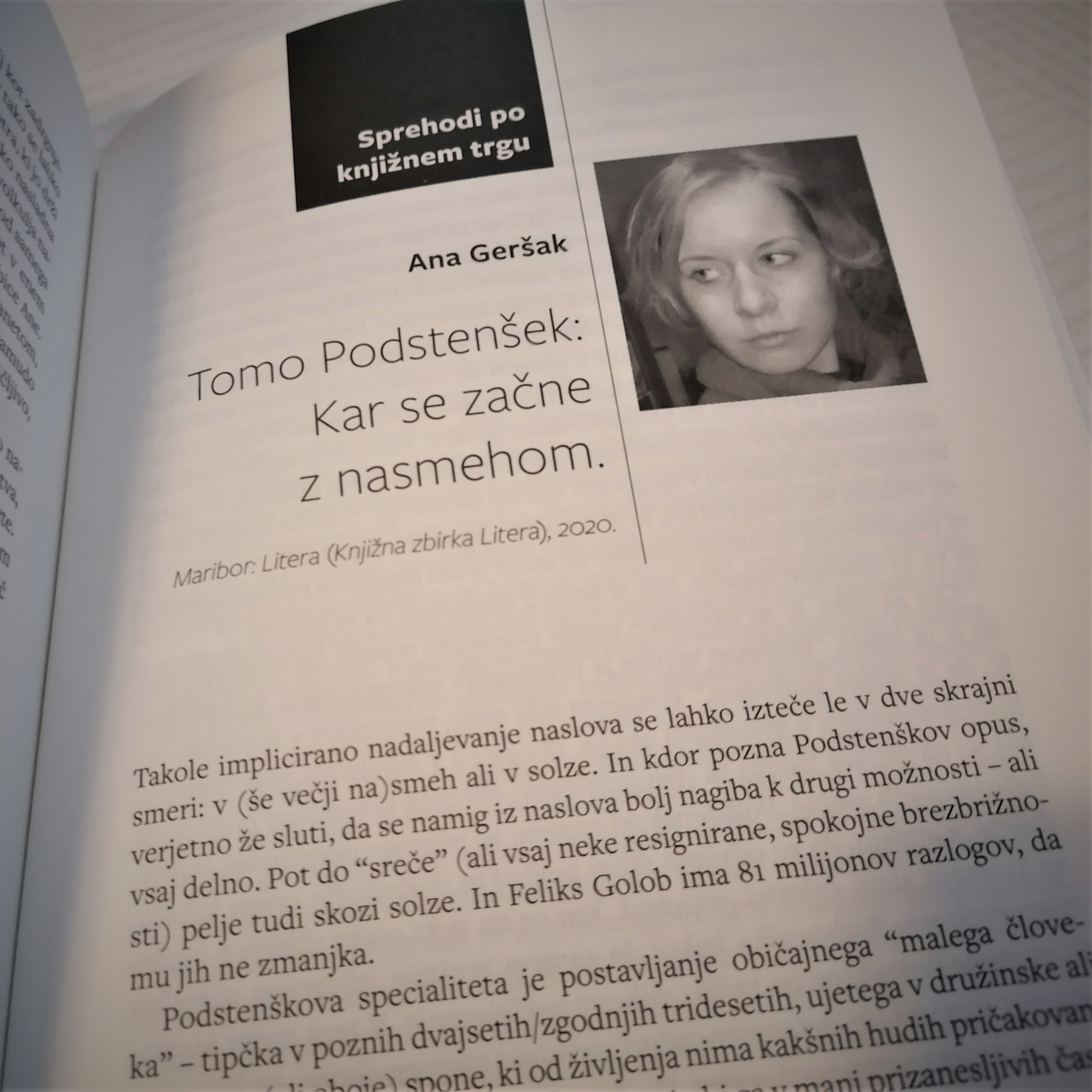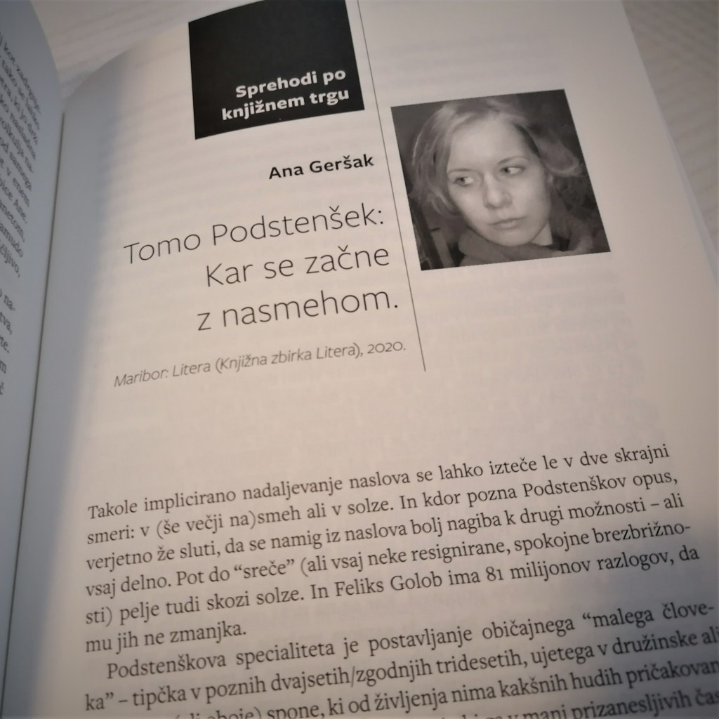 V oktobrski številki revije Sodobnost je bila objavljena kritika romana Kar se začne z nasmehom (Litera, 2020), o njem je pisala Ana Geršak.