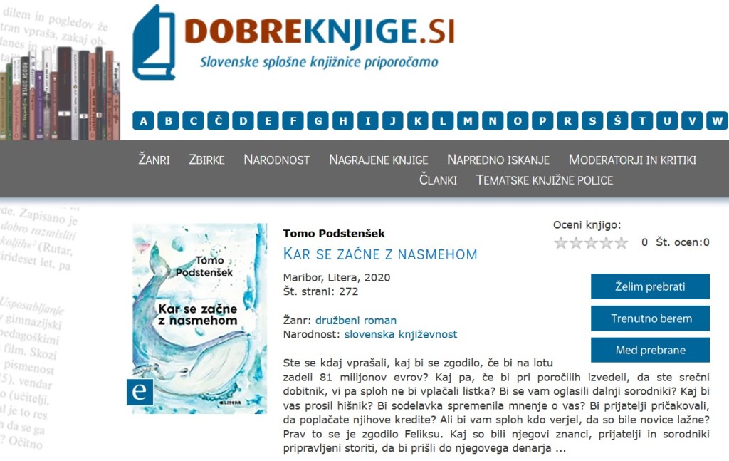 Na portalu dobreknjige.si knjižničarji priporočajo v branje tudi roman Kar se začne z nasmehom (Litera, 2020), kratko predstavitev knjige je napisala Simona Lužar iz Knjižnice Pavla Golie Trebnje.