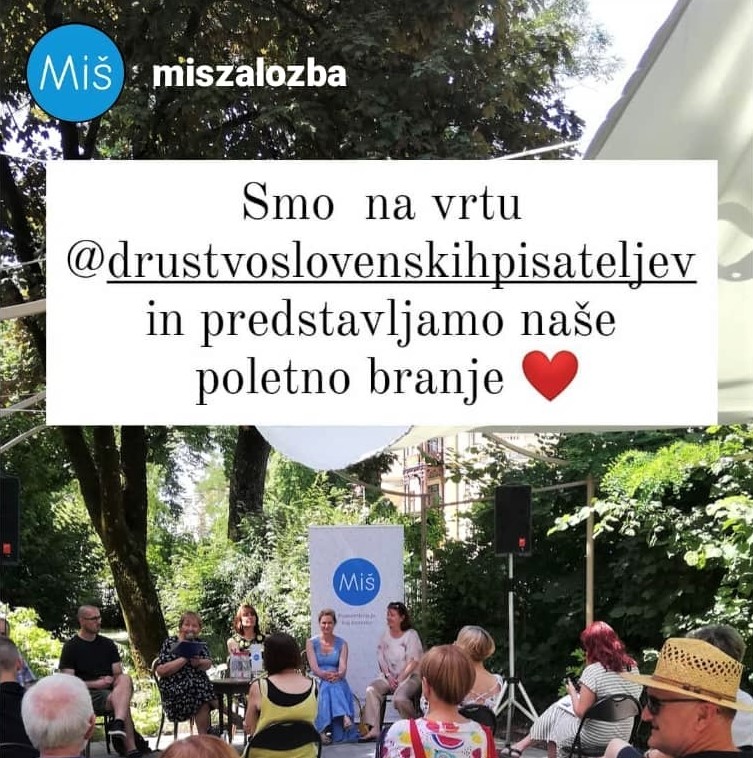 V torek, 29. 6., smo na vrtu Društva Slovenskih pisateljev v pogovoru z Ireno Miš Svoljšak predstavili nove knjige založbe Miš: romane Samo domov me pelji Igorja Karlovška, Beseda, ki je nimam Nataše Konc Lorenzutti, Balada o drevesu Mateje Gomboc, Meter in pol pomladi Petje Rijavec in moje kratkoprozne Zgodbe za lažji konec sveta.