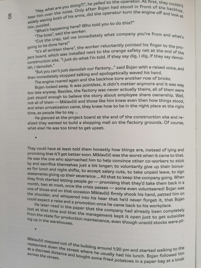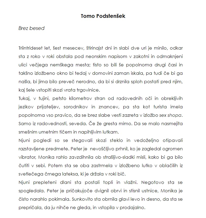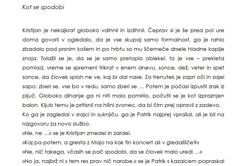 “Uroš je ravno postrgal s krožnika ostanke pogrete lazanje in zlagal posodo v pomivalni stroj, ko je pri vratih pozvonilo. Najbrž je Lara spet kaj naročila, je pomislil. Odkar so imeli tisto epidemijo in so bili več mesecev tako rekoč zaprti v izolaciji, je začela skoraj vse kupovati v spletnih trgovinah. Virus je med tem mutiral v manj nevarno in nalezljivo obliko, vlada je preklicala varnostne ukrepe, Larina navada nakupovanja s kavča pa je ostala. /…/”
