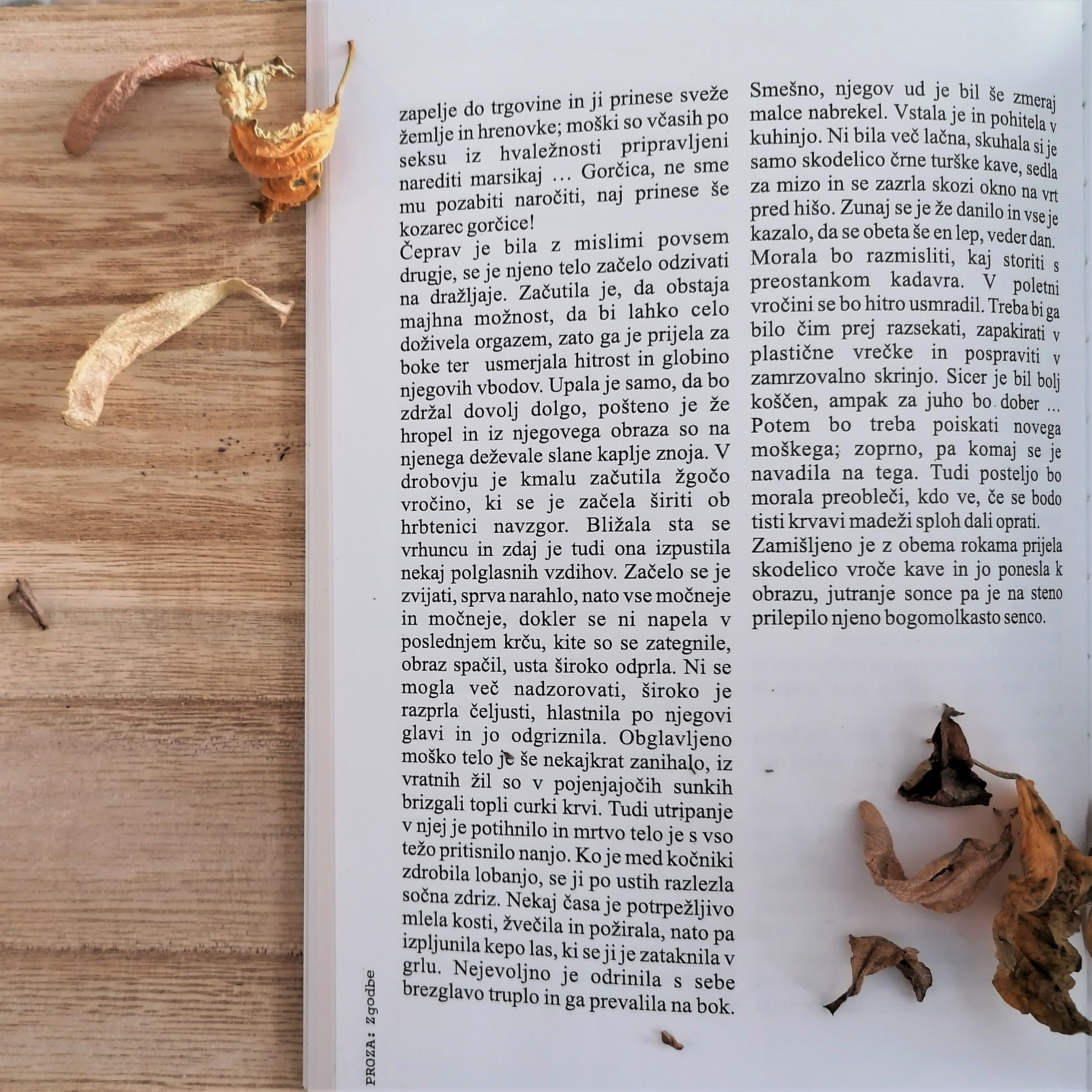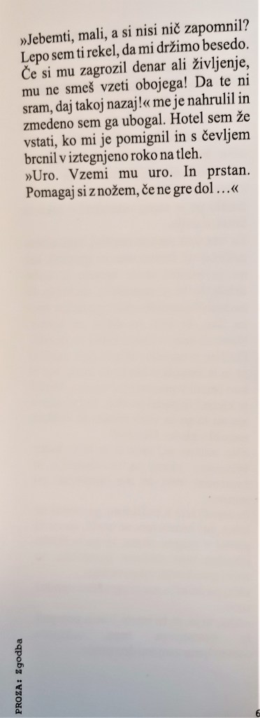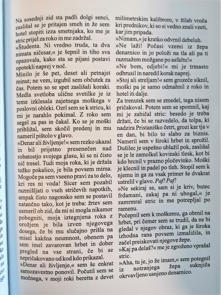 “Uroš je ravno postrgal s krožnika ostanke pogrete lazanje in zlagal posodo v pomivalni stroj, ko je pri vratih pozvonilo. Najbrž je Lara spet kaj naročila, je pomislil. Odkar so imeli tisto epidemijo in so bili več mesecev tako rekoč zaprti v izolaciji, je začela skoraj vse kupovati v spletnih trgovinah. Virus je med tem mutiral v manj nevarno in nalezljivo obliko, vlada je preklicala varnostne ukrepe, Larina navada nakupovanja s kavča pa je ostala. /…/”
