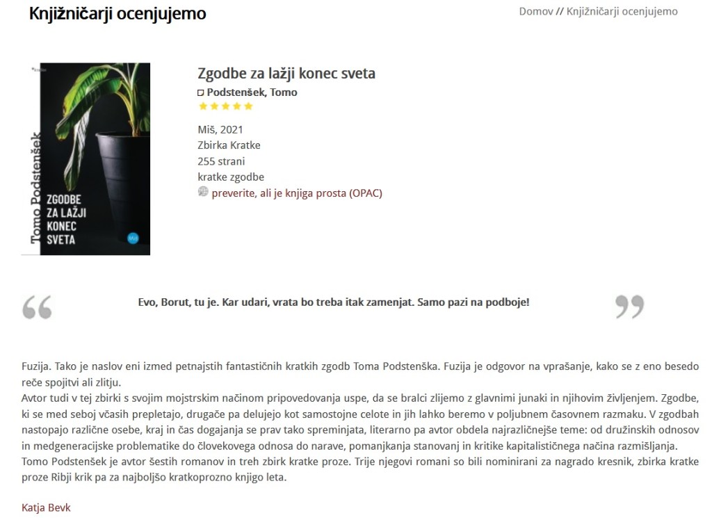 Na spletnih straneh Knjižnice A. T. Linharta Radovljica knjižničarji ocenjujejo in priporočajo izbrane knjige, o zbirki Zgodbe za lažji konec sveta (Založba Miš, 2021) je pisala Katja Bevk: