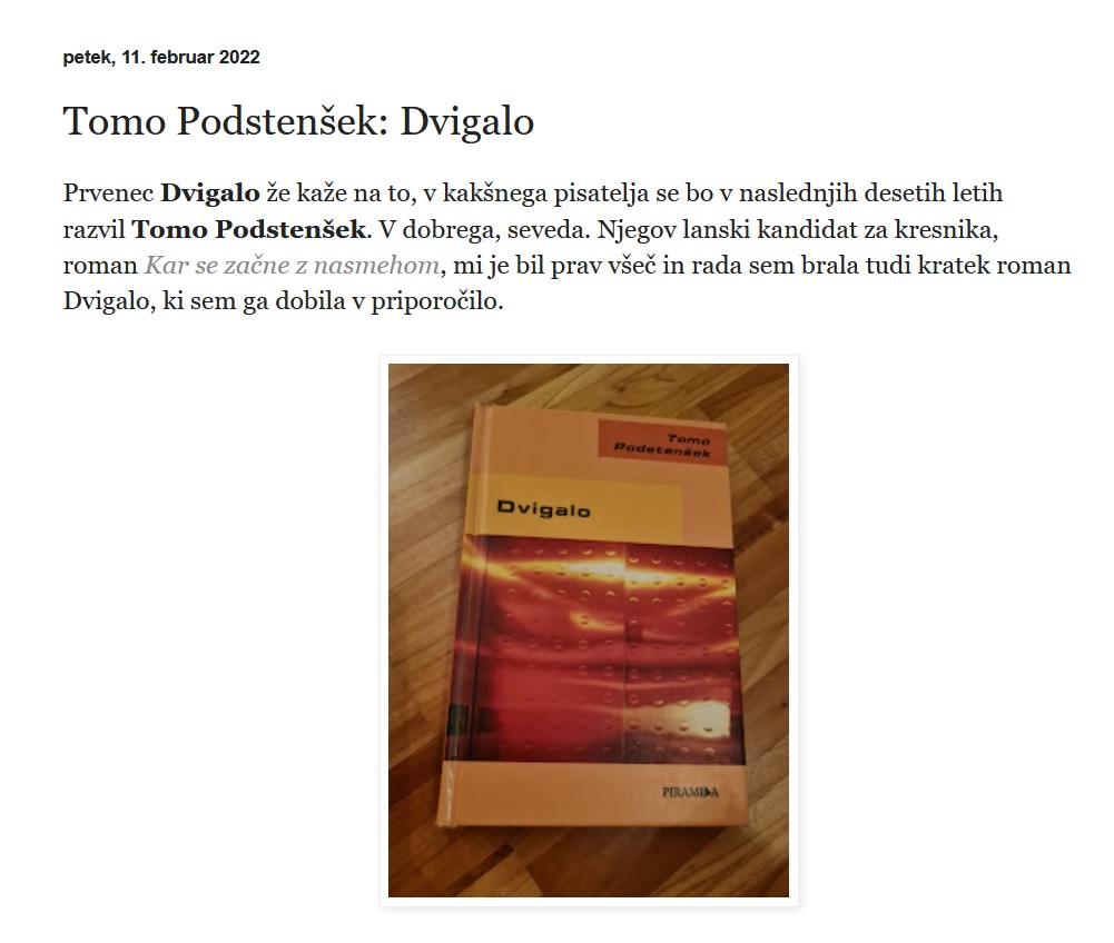 V radijski oddaji Literarni nokturno bo v ponedeljek, 11. 4. 2022, predvajan odlomek iz romana Papir, kamen, škarje (Litera, 2016) v interpretaciji Gregorja Grudna.
