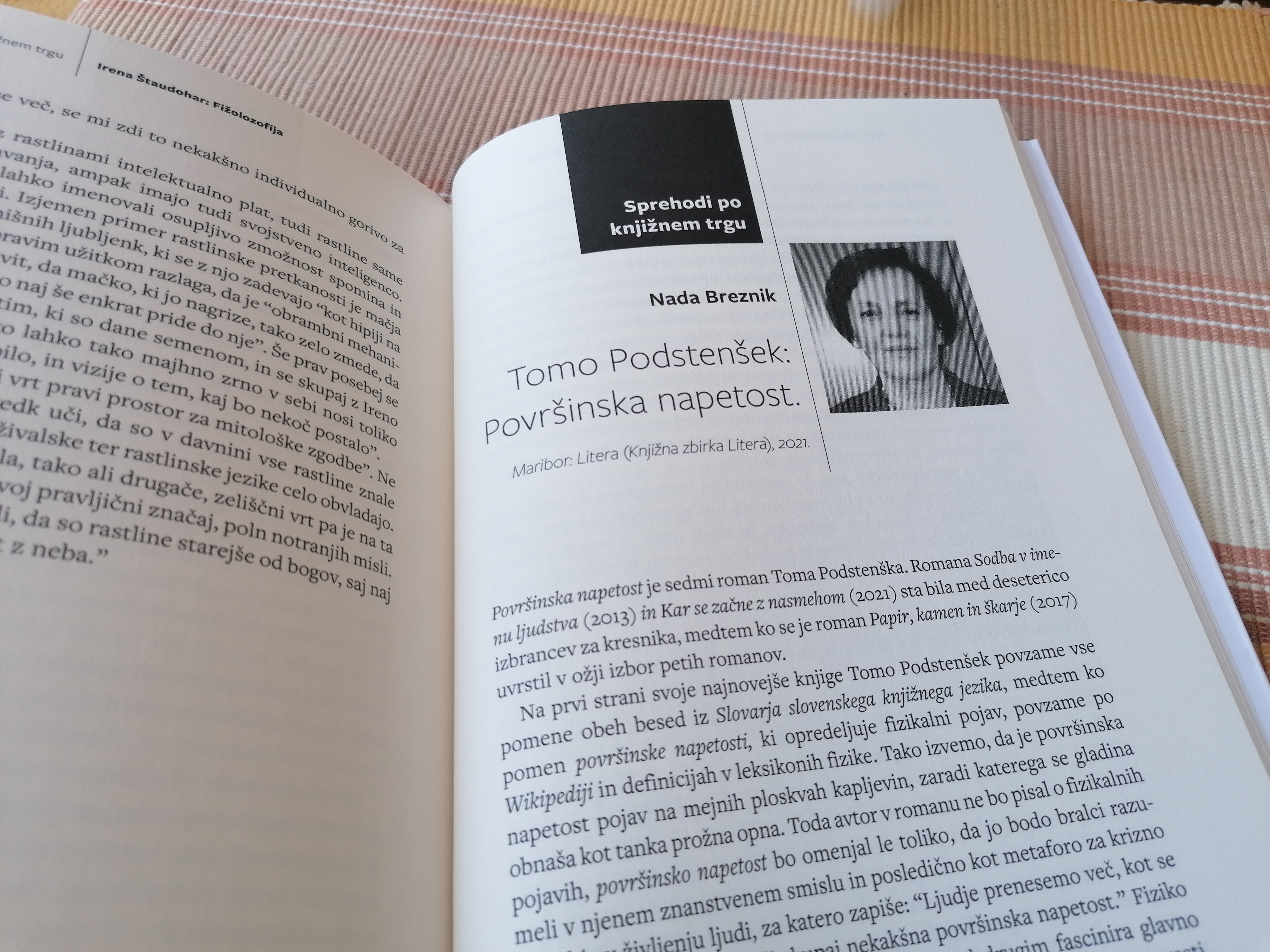 Na spletnem portalu dobreknjige.si je priporočan v branje in predstavljen tudi roman Površinska napetost (Litera, 2021), zapis je prispevala Metoda Jereb iz Mestne knjižnice in čitalnice Idrija.