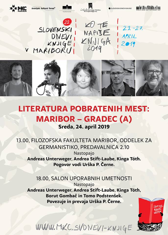 KDO? Pesnik, pisatelj in urednik Andreas Unterweger, pistaeljica in urednica Andrea Stift-Laube, pesnica in performerka Kinga Tóth, pesnik Borut Gombač, pisatelj Tomo Podstenšek; prevajalka in povezovalka dogodka Urška P. Černe.